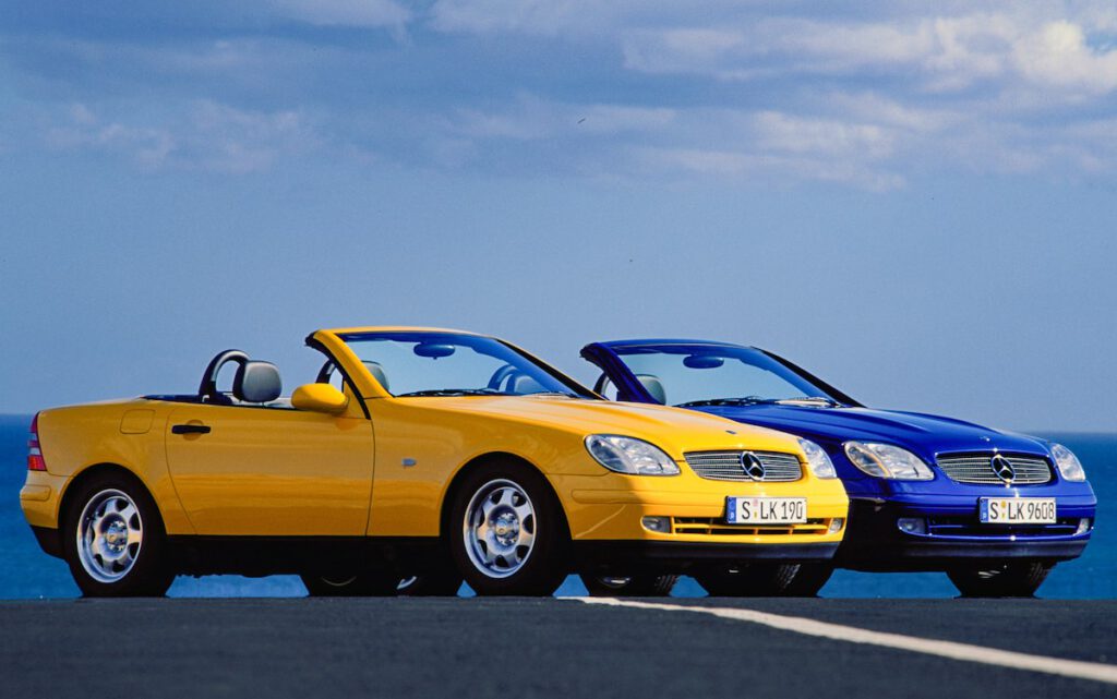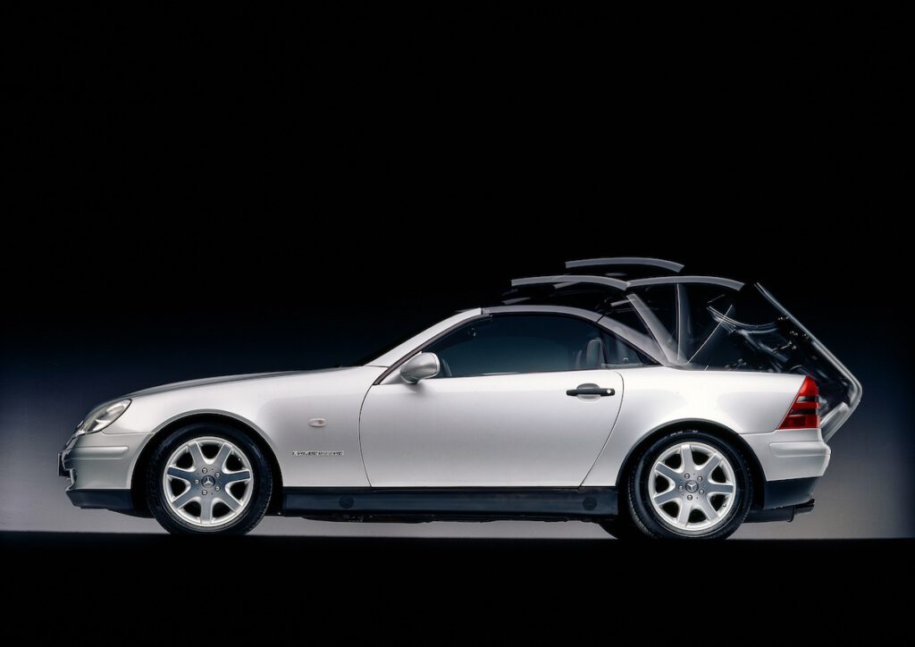 Vom kompakten und eleganten Roadster in nur 25 Sekunden zum wetterfesten Coupé: Das bietet der Mercedes-Benz SLK der Baureihe 170, dessen einzigartiges Stahl-Variodach sich auf Knopfdruck öffnet und vollautomatisch in den Kofferraum faltet. Mit diesem Sportwagen begründet Mercedes-Benz erfolgreich ein neues Marktsegment. Die Marke präsentiert den SLK auf dem Turiner Autosalon im April 1996.