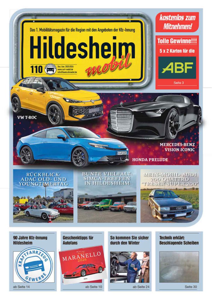 Die HILDESHEIMmobil Dezember/Januar 2025/26 (Nr. 110) wird derzeit an die Vertriebsstellen in der Region geliefert und steht hier zum Download bereit:
